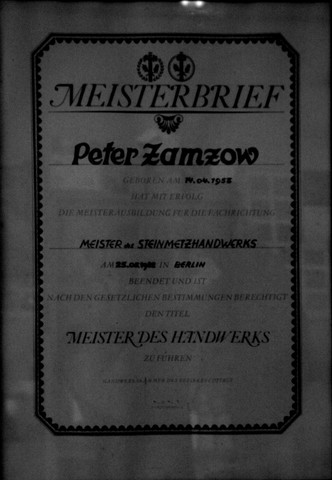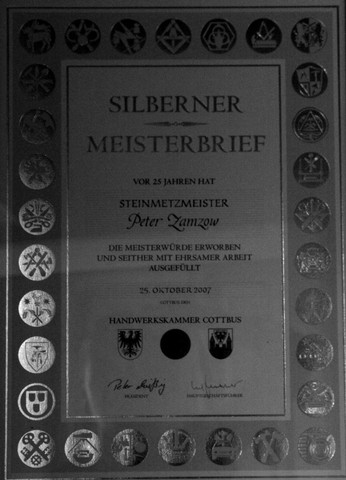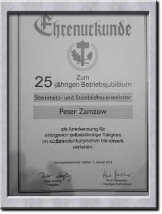 1989 übernahm Peter Zamzow das väterliche Geschäft in dritter Generation. Altmeister Gerhard und Peter haben sich den Dienst am Kunden verschrieben. "Die Zufriedenheit der Kunden bestimmt unsere Arbeit" so Peter Zamzow. Auch in vierter Generation soll der Meisterbetrieb fortbestehen. Oliver, Sohn des jetzigen Chefs, geht als Grabmalservice Zamzow in eingetragener Selbstständigkeit seinem Vater zur Hand. "Steinmetzkunst im Dienste des Kunden" wird es also auch in Zukunft in Calau heißen. Doch nicht nur hier in der Stadt hat die Firma Zamzow einen guten Namen. In ganz Deutschland stehen Steine aus der hiesigen Werkstatt. Ob in Berlin oder Bayern, die Calauer arbeiteten schon auf vielen Friedhöfen.